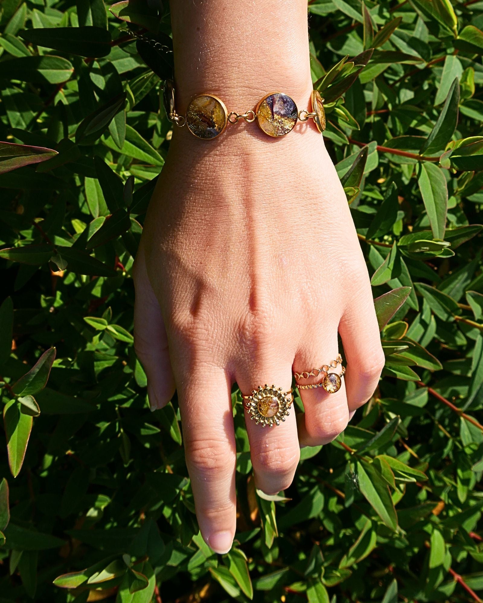 La bague Marisa est réglable et en acier inoxydable avec son rond marron et doré façonné à la main. Cette bague marbrée s'illumine à la lumière avec des détails uniques. Sa forme volumineuse sera parfaite pour habiller votre main une bague imposante mais colorée. Le choix idéal pour une personne qui aime les pièces volumineuses. La taille commence au 52 et peut s'ouvrir en fonction de votre doigt.