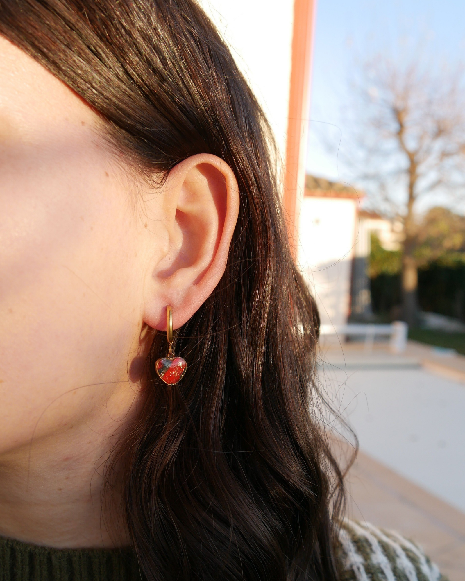 Boucle d'oreille unitaire en acier inoxydable et avec son motif grand coeur rouge et vert foncé fait-main en argile polymère et résine. Chaque motif est unique.