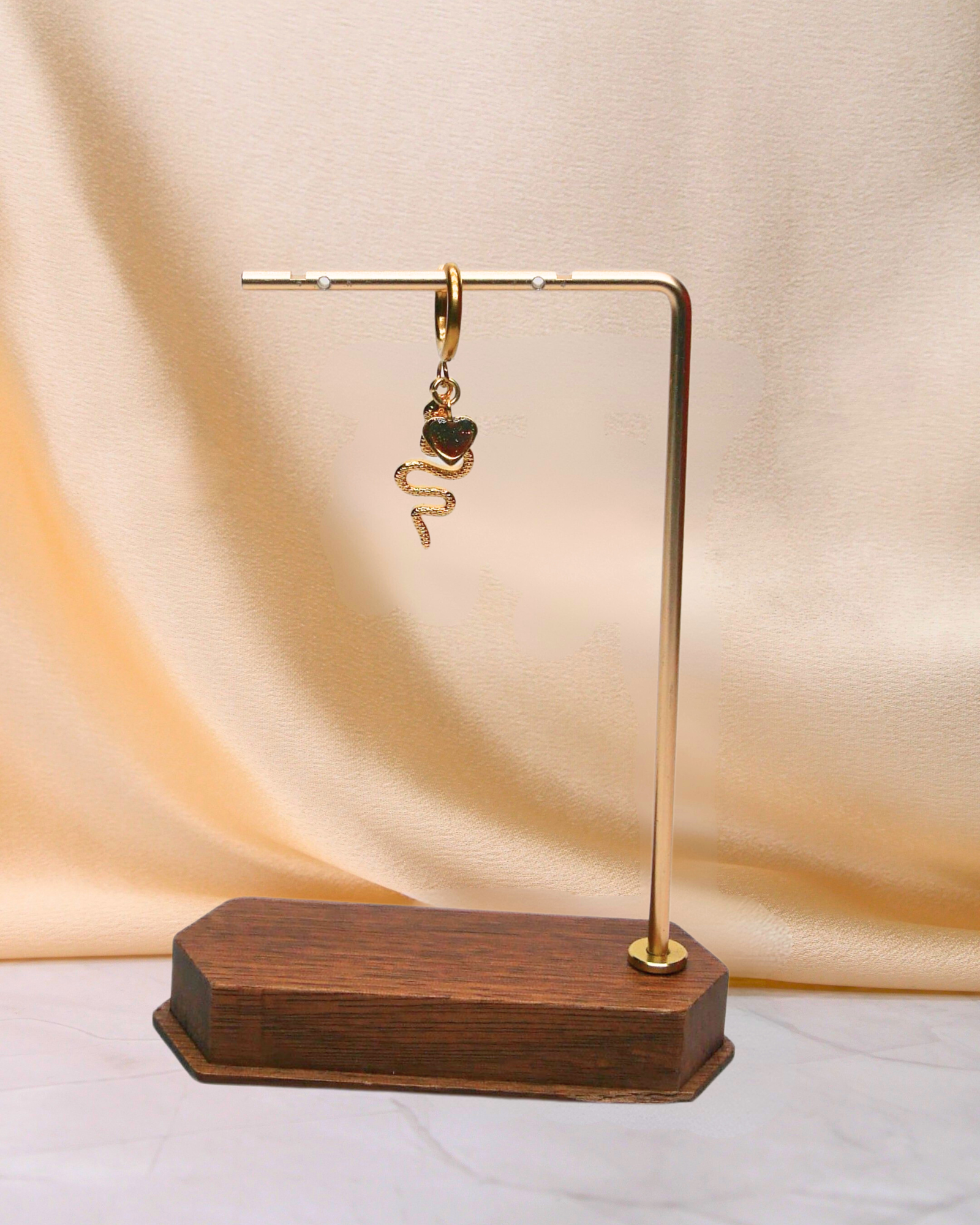 Boucle d'oreille unitaire en acier inoxydable et avec son serpent et son coeur rouge et vert foncé fait-main en argile polymère et résine. Chaque motif est unique.