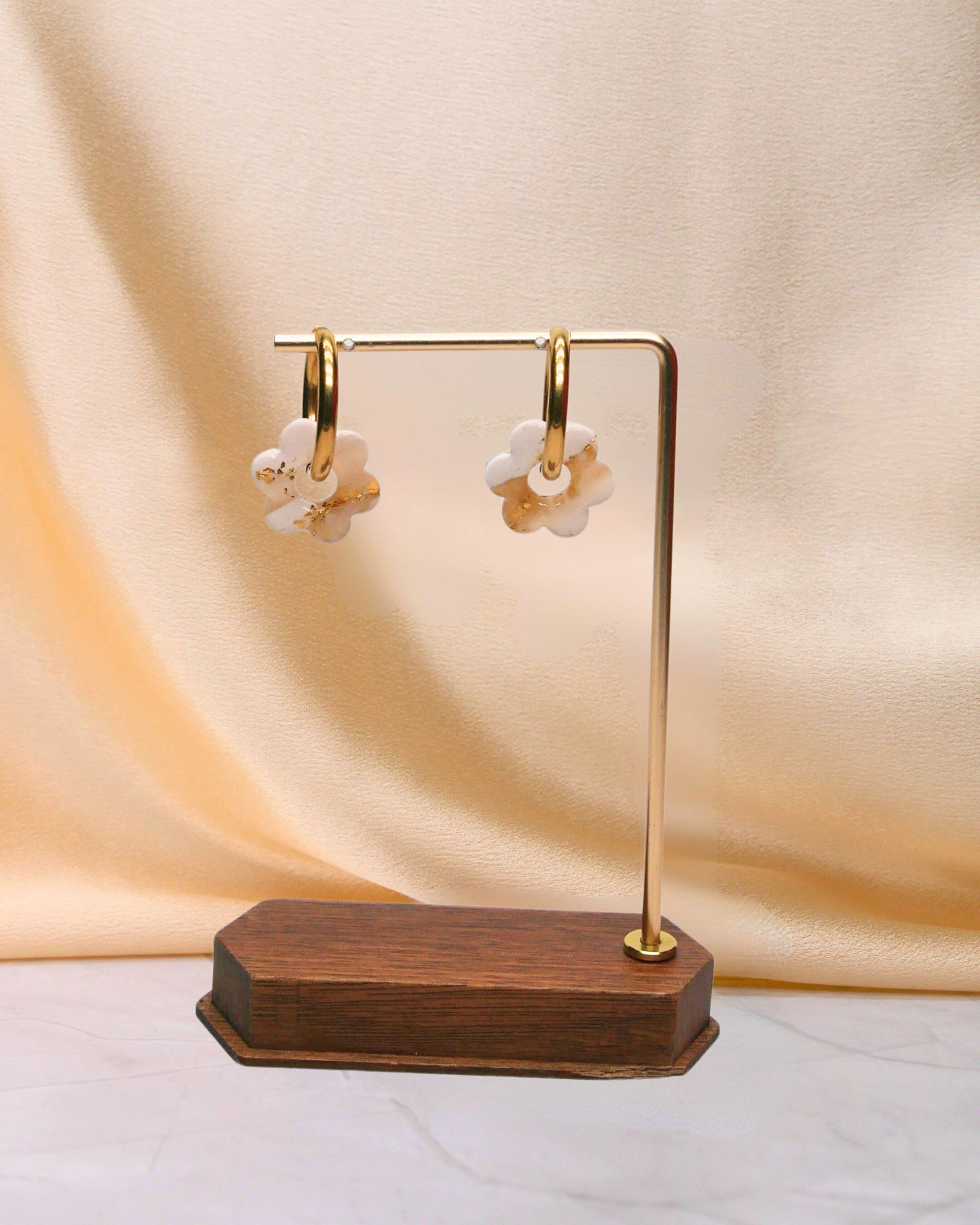 Ces créoles dorées en acier inoxydable ornées de petites fleurs marbrées blanches et transparentes. Les fleurs sont fabriquées à la main en France en argile polymère recouvert de résine. Ces créoles sont parfaites pour ajouter une touche lumineuse à vos tenues. Ce motif est unique et non reproductible.