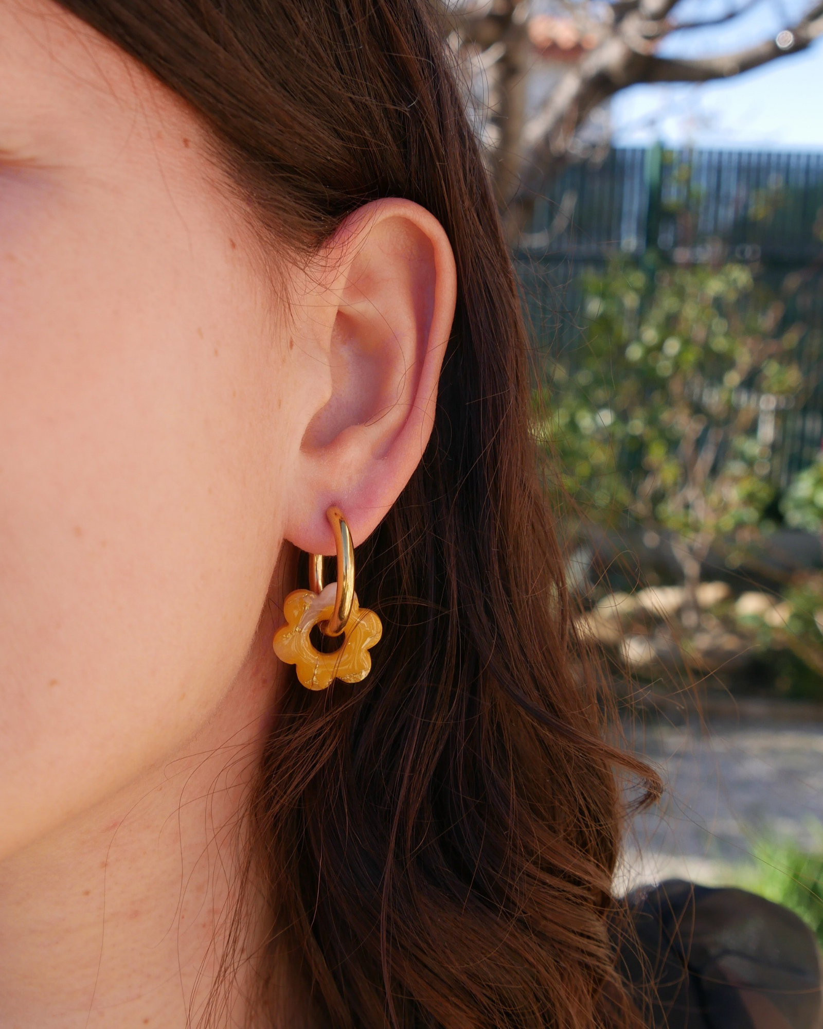 Les créoles fleurs jaunes Maison Oneiri sont idéales pour apporter une touche lumineuse et solaire à vos tenues. Le jaune marbré, associé au transparent et à de délicates touches de feuille d’or, capte la lumière et illumine instantanément le visage.