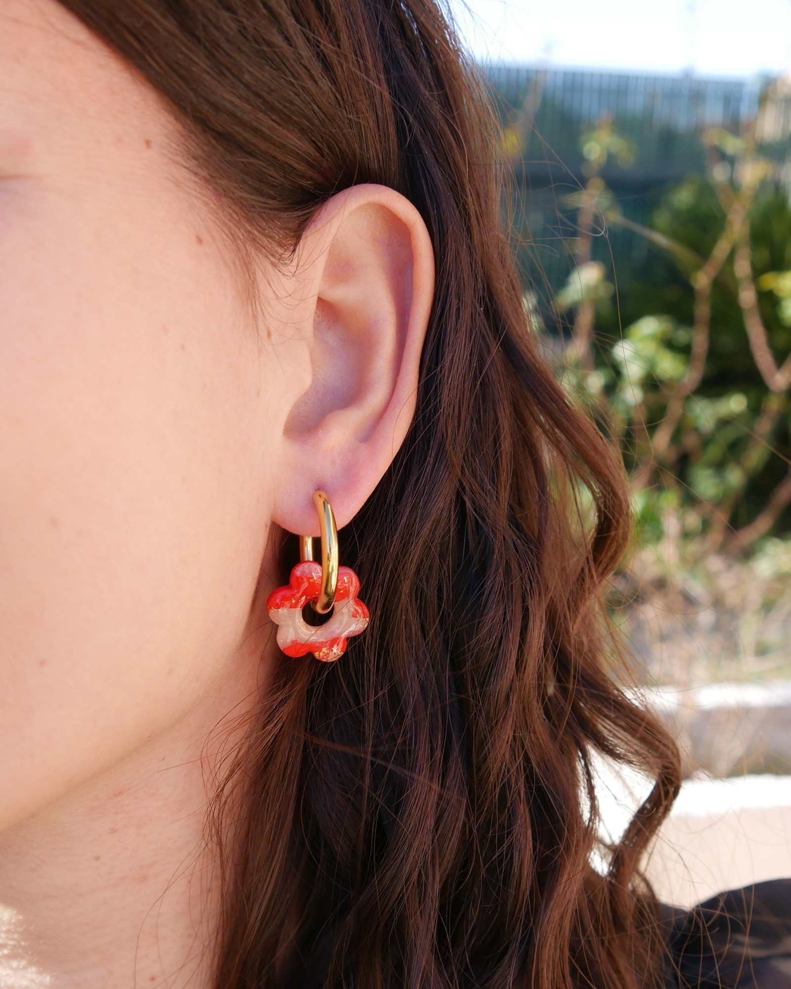 Les créoles fleurs rouge Maison Oneiri sont pensées pour celles qui aiment les bijoux colorés, faits main et modulables. Chaque fleur est unique, façonnée en argile polymère et recouverte de résine, avec des touches de transparent et feuille d’or, garantissant un motif non reproductible.