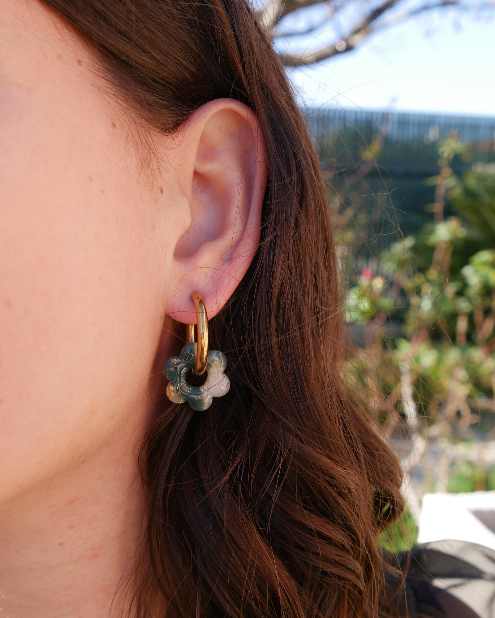 Les créoles fleurs vert foncé Maison Oneiri ajoutent une touche élégante et naturelle à vos looks. Ces boucles d’oreilles en acier inoxydable doré sont ornées de fleurs marbrées vert foncé et transparentes avec feuille d’or, entièrement fabriquées à la main en France.