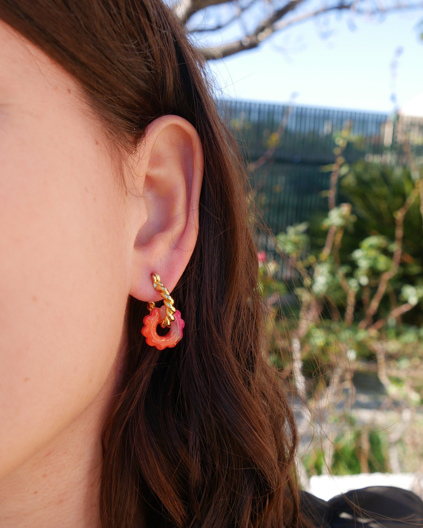 Les créoles petites fleurs rose, orange et transparent avec feuille d’or, créant un bijou pétillant et unique. Ces couleurs flashy apportent une touche de fun et de luminosité à vos tenues, parfaites pour égayer un look casual ou plus habillé.